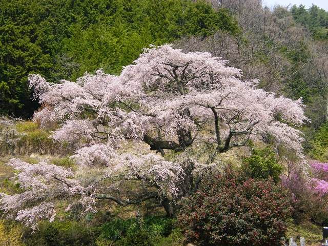 中川村西丸尾の樹齢450年といわれるシダレザクラはちょうど見ごろ。そのすこし下ったところにある茅葺屋根と桜はのどかな田園風景で日本を感じる静かなところ。